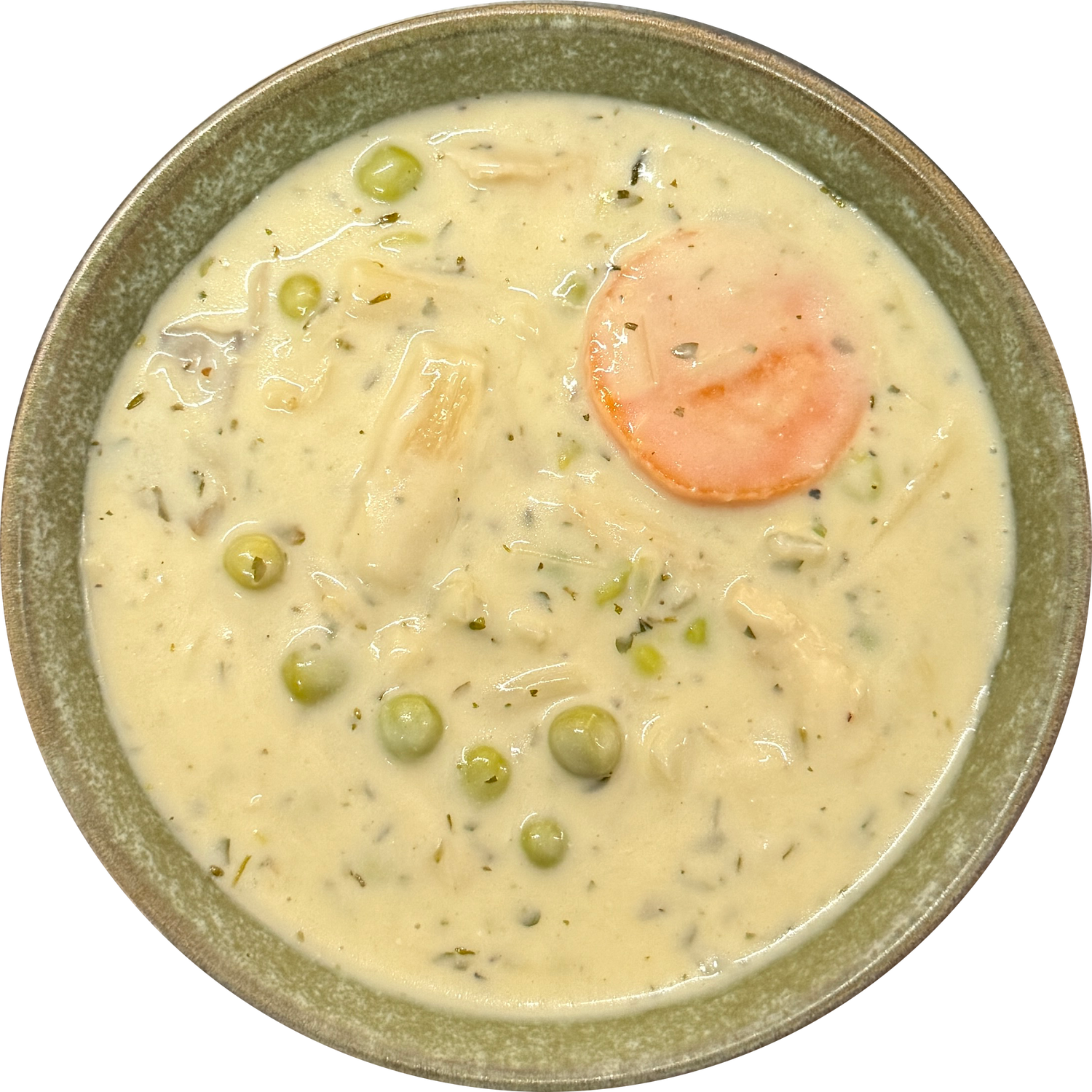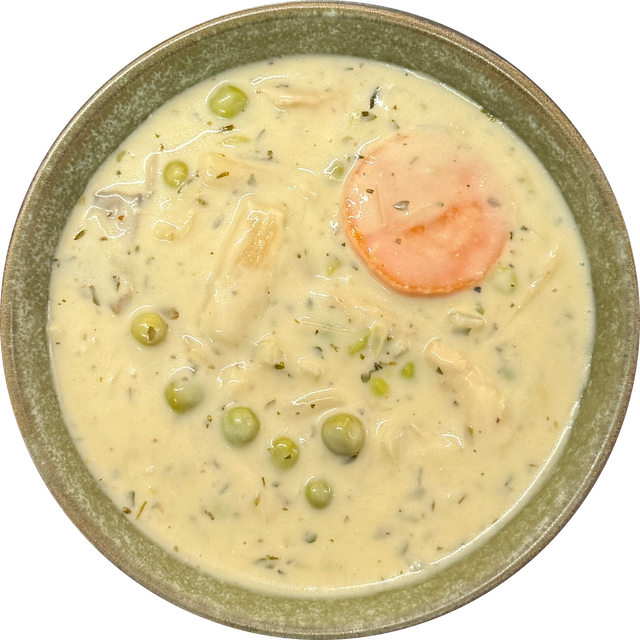 Vores hønsefrikassé er en sand klassiker, lavet på mørt plukket kyllingekød i en mild, cremet opbagt sauce med gulerødder og ærter. Smagen er rund, blød og fuld af nostalgi – præcis som den skal være. En ret der varmer helt ind i sjælen og samler hele familien omkring bordet. Serveres perfekt med små kogte kartofler og et drys frisk persille.